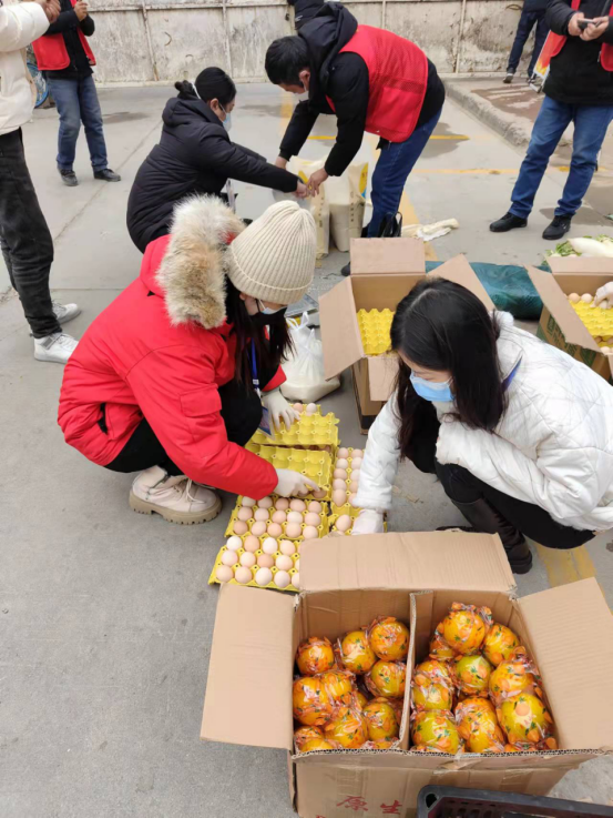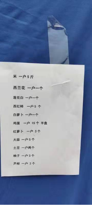 志愿者不敢耽搁,群众还等着食材做午饭呢。她们快步返回村里志愿者服务集中配送点,又提着配备好的5斤米、半盘鸡蛋、蔬菜10斤、水果3斤,赶往下一个群众家中……