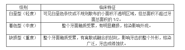 氟斑牙又称“斑釉症”,可见牙齿釉面呈白垩色条纹或斑块;釉面出现黄棕色至棕黑色着色;也可因釉质缺损而在釉面出现凹坑。氟斑牙发生后终生不退,轻者影响外观和美容,重则影响咀嚼及消化功能。