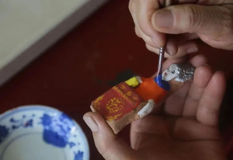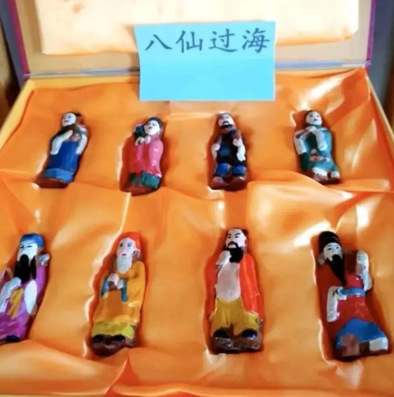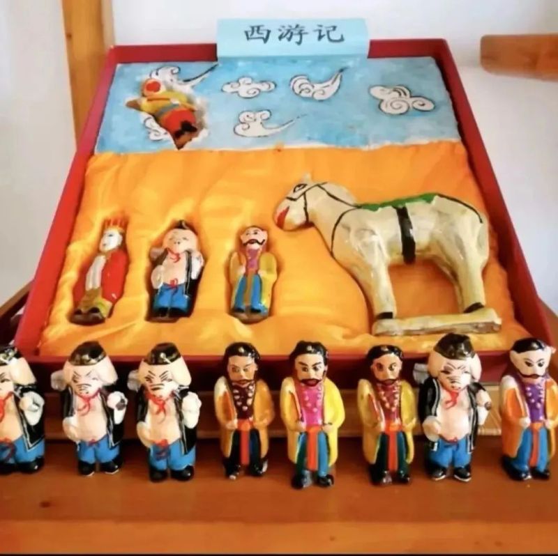接下来选取自己喜欢的模具形象,把泥放入模具,晾半天,用刻刀把边沿不规则的地方修平,阴干一个礼拜,放在太阳下暴晒十天左右,进行烧制,最后一步是上色,一般人物上色顺序为手、脸、衣服、头发、鼻子、眼睛、眉毛、嘴巴,画完以后,晾一至两天,用清漆刷一遍,再晾三天,一件艺术品就完成了。