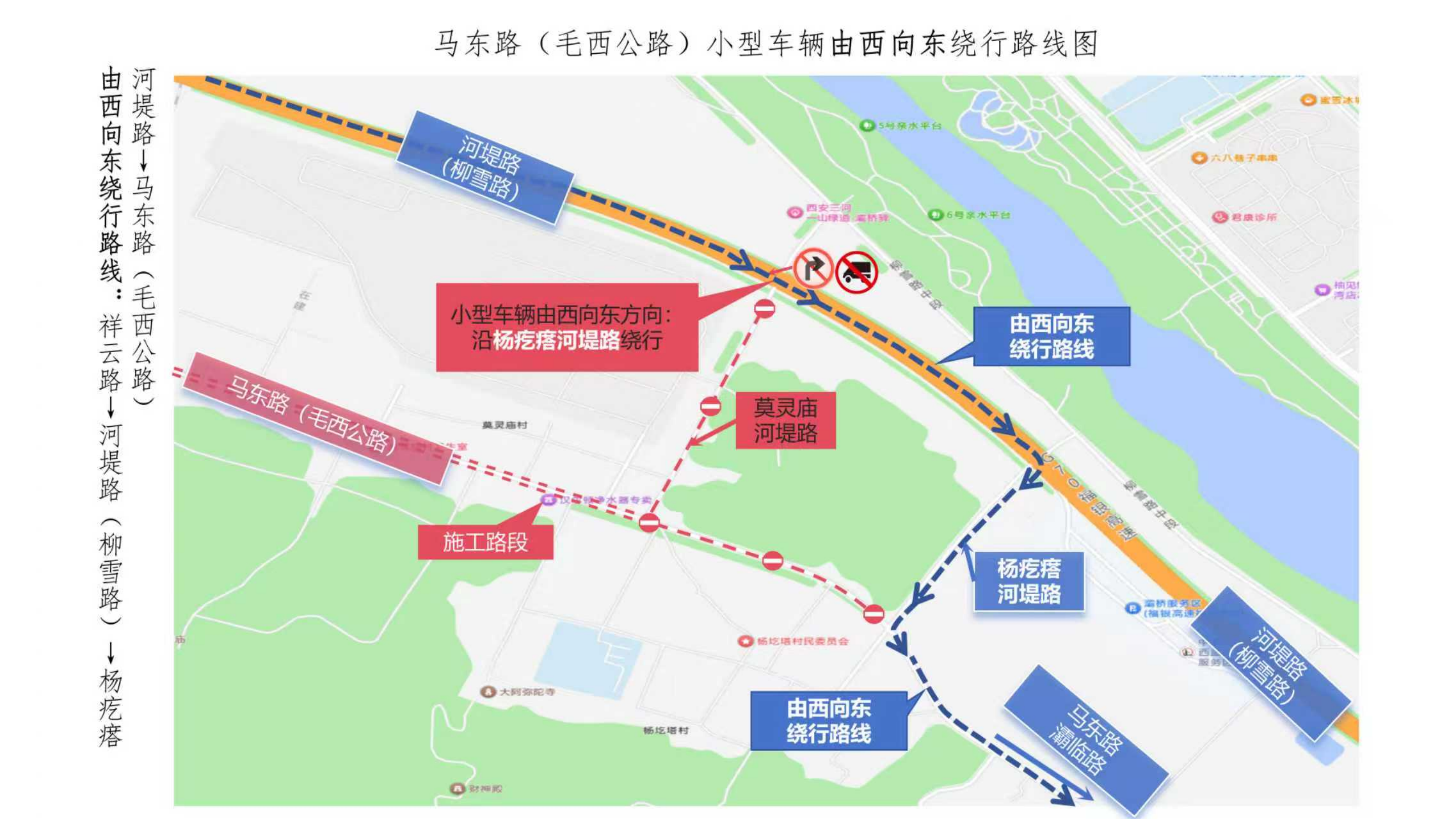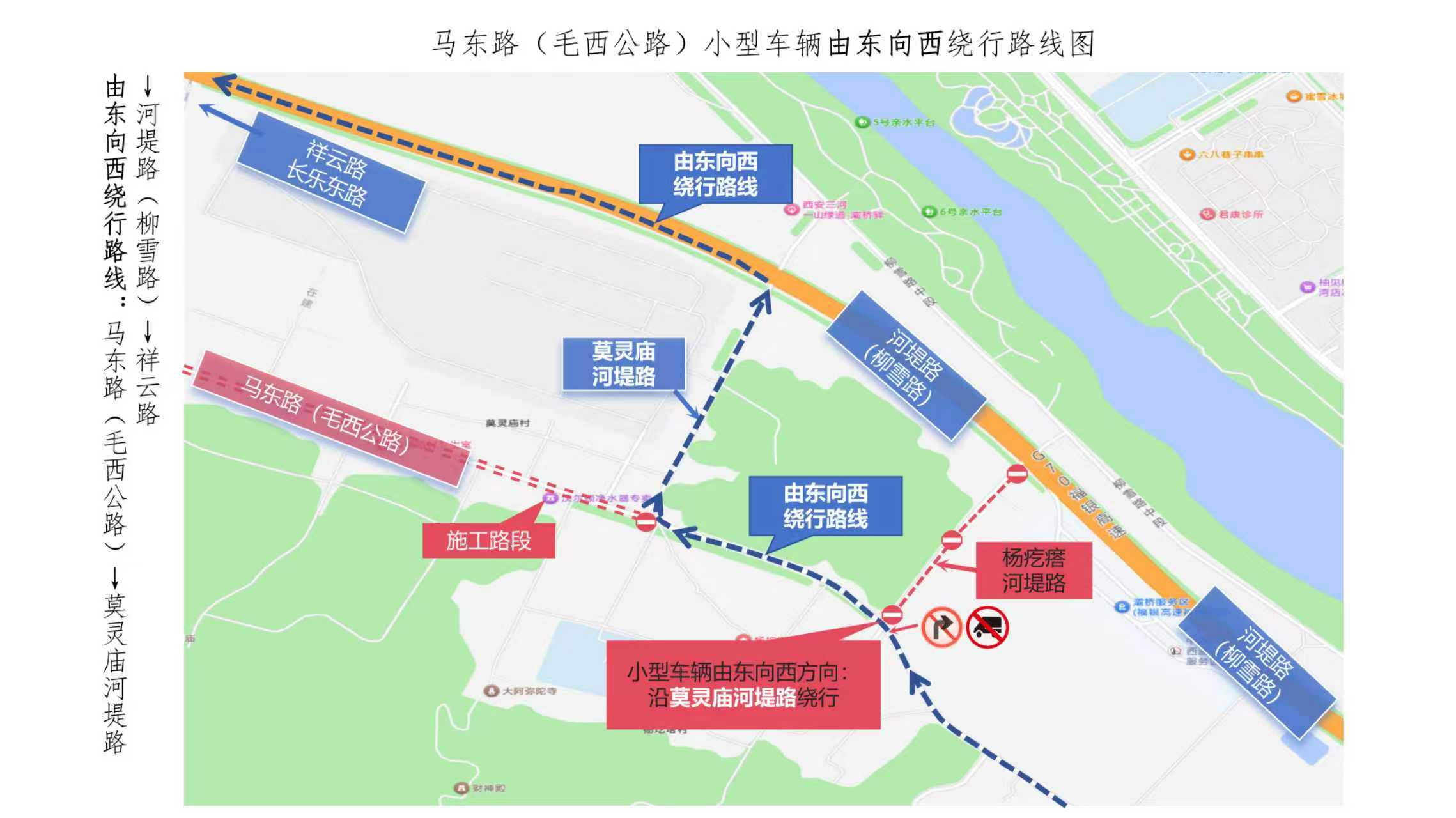 小型车辆绕行路线:1.由西向东绕行路线:祥云路→河堤路(柳雪路)→杨疙瘩河堤路→马东路(毛西公路);大型车辆禁止通行。