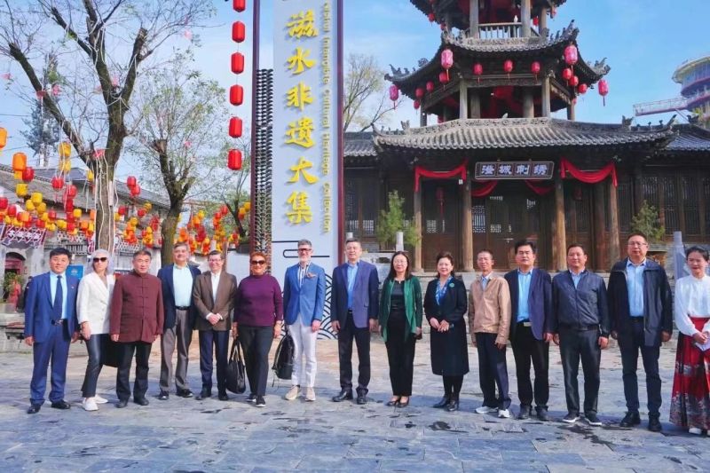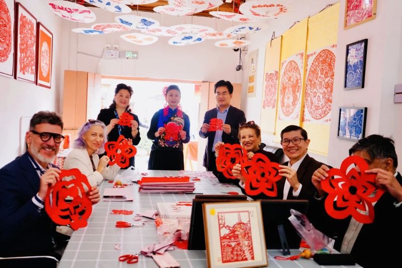 随后,参访团参观了民国街和白鹿原古街。民国街两边的建筑各具特色,老宅院落、古典门窗、青石板路等,散发着浓厚的怀旧氛围。外宾们行走在这些古老的街巷中,欣赏到民国风格的工艺品、家具、瓷器、字画等,领略着独特的民国风情。