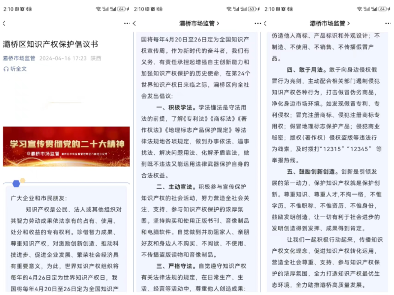 二是发布一个保护倡议。区知强办通过灞桥市场监管微信公众号在全市率先发布《灞桥区知识产权保护倡议书》,向全社会发出积极学法、主动宣法、严格守法、敢于用法、鼓励创新创造五项倡议内容,线上线下相结合为知识产权宣传周做好预热,积极营造全社会尊重、支持、参与知识产权保护的浓厚氛围。
