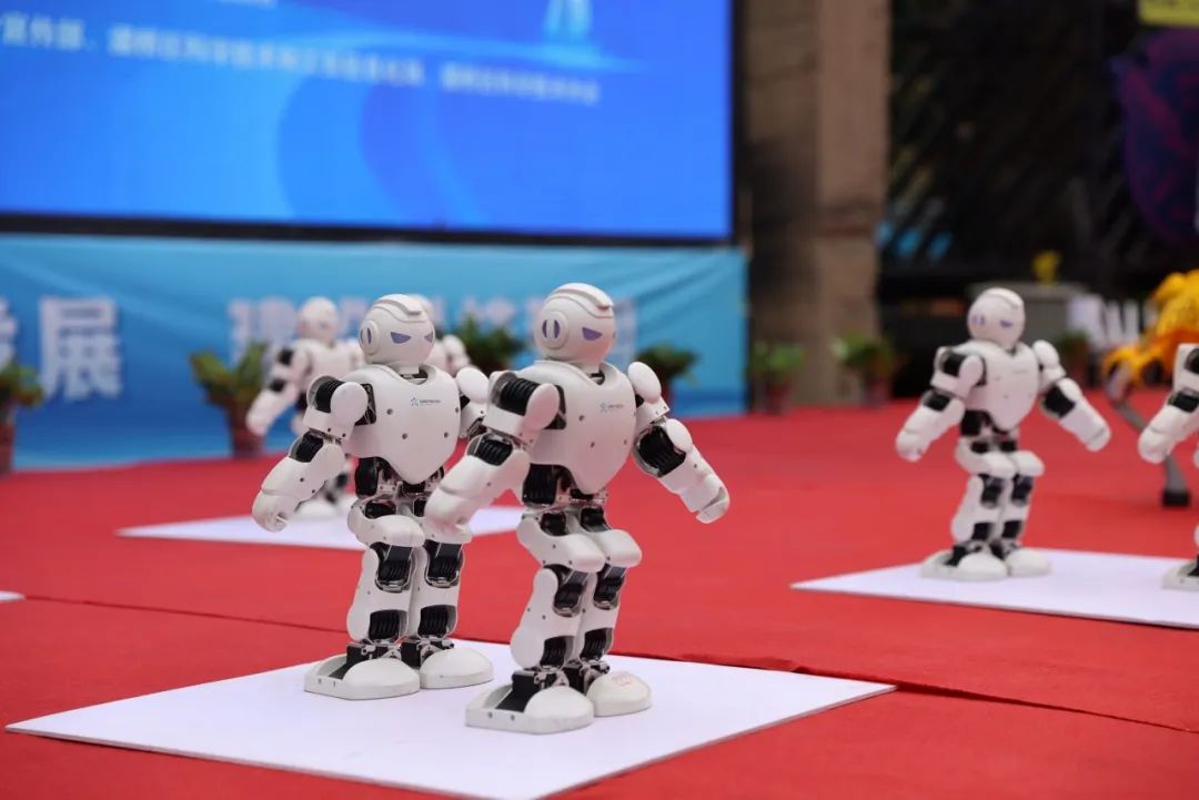 活动在充满科技感的“赛博醒狮”(机器狗扮饰)与阿尔法机器人联袂表演中拉开序幕。现场,4只灵动的赛博醒狮与20台阿尔法机器人翩然共舞。机器人以毫米级精准动作诠释科技张力,醒狮元素服饰在机械律动中彰显了传统美学,二者随节拍默契交织,刚硬的机械臂与柔软的狮尾呼应,展现了人工智能与艺术融合的魅力,赢得现场观众阵阵掌声。