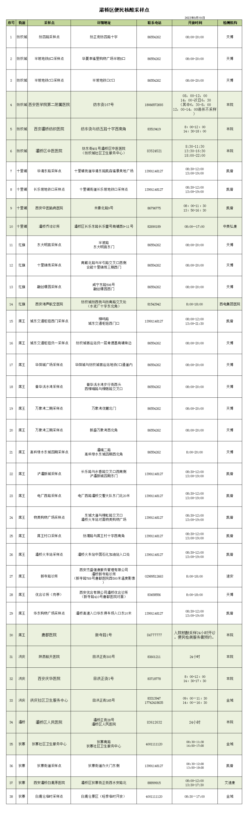 今后,灞桥区将定期通过微信公众号”今日灞桥“、融媒体、微信朋友圈等数字化形式,及时发布灞桥区核酸采样点调整增设情况,同时公布采样点位置、服务时段、联系方式、收费情况等信息,便于市民查询。借助大数据手段,通过全员核酸检测系统实时分析各点位排队等情况,不断提升采样服务的精准性和便利度。