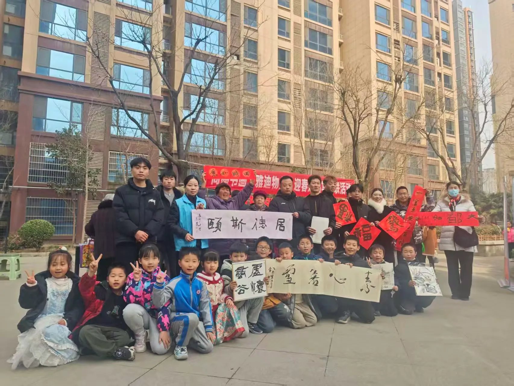 活动现场暖意融融,欢声笑语不绝于耳。业主们围聚在书桌旁,有的认真挑选心仪的春联内容,有的驻足欣赏书法家们笔走龙蛇的精湛技艺,不时发出阵阵赞叹;孩子们被笔墨书香吸引,好奇地围观学习,感受传统文化的独特魅力。不少业主还提出个性化需求,“想写一副关于家庭和睦的春联”“希望福字能大气一些”,书法家们一一应允,量身创作专属墨宝。社区工作人员与雅迪物业的工作人员穿梭其间,热情地为业主递纸、研墨、晾晒春联,耐心解答疑问,让整个活动井然有序又温情满满。