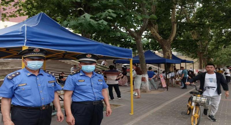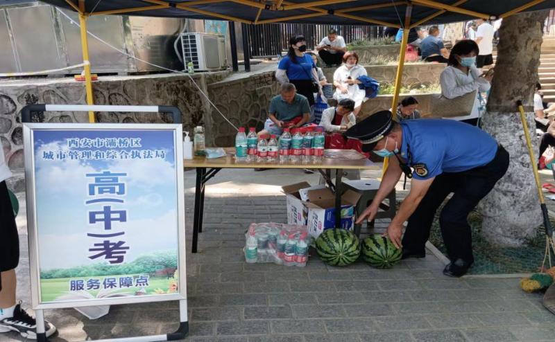 考试期间,纺织城街道执法中队安排执法队员在辖区考点学校定点执勤管理,并为考生及考生家长提供矿泉水、西瓜、文具、医疗物资等便民服务。