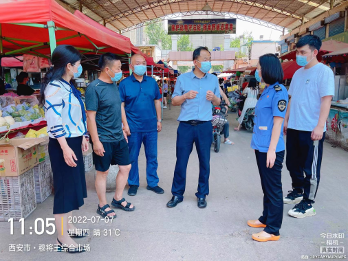 7月7日上午,副区长孙见林带队深入辖区农贸市场,实地督导检查穆将王农贸市场疫情常态化和食品安全工作落实情况,区市场监督管理局局长周筱梅和红旗所相关执法干部参与检查。