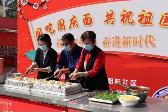 朝阳社区党委书记、西安新纪元烹饪学校负责人参加了本次活动的仪式并讲话。朝阳社区党委书记、居委会副主任及西安新纪元烹饪学校负责人三人共同切开祝福伟大祖国诞辰73周年的方形蛋糕,并分发给参加活动的朝阳社区居民品尝。西安新纪元烹饪学校的师生将制作好的岐山臊子面依次递给排成一字队形居民品尝、评价。