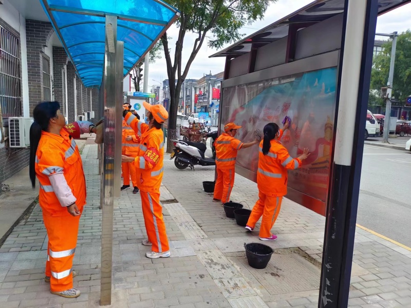 二、聚焦弘正气鼓干劲,在比学赶超中树标杆。狄寨街道继续组织54名保洁员和25名城管队员,对水安路、环镇北路、东月路及白鹿仓周边进行全面清洁。保洁人员对沿路宣传栏、公交站牌、垃圾箱等基础设施进行擦洗,对绿化带、道路死角垃圾进行清扫,大家干劲十足,形成一道美丽的橙色“风景线”。街道商户也积极加入清扫队伍,清理商铺门口堆放的垃圾、杂物。累计擦洗门店155家,清扫道路12.5公里,清运垃圾12车。