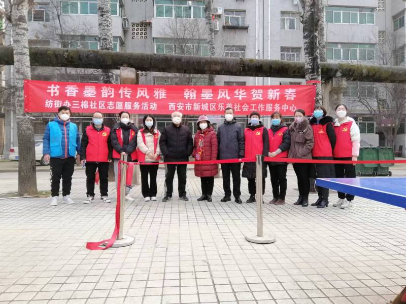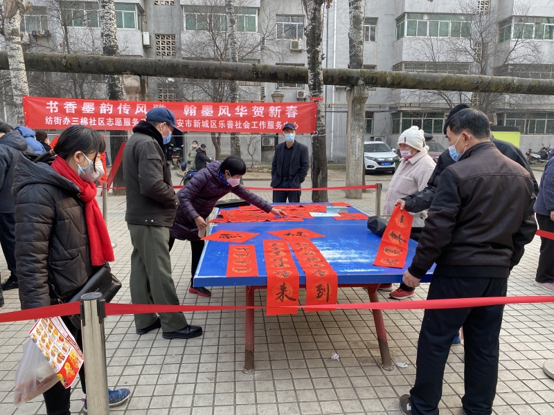 为进一步传承弘扬中华优秀传统文化,营造健康向上、喜气洋洋的节日氛围,1月11日,纺织城街道三棉社区联合西安市新城区乐善社会工作服务中心在北院民主村广场开展了“书香墨韵传风雅,翰墨风华贺新春”服务活动。