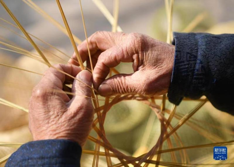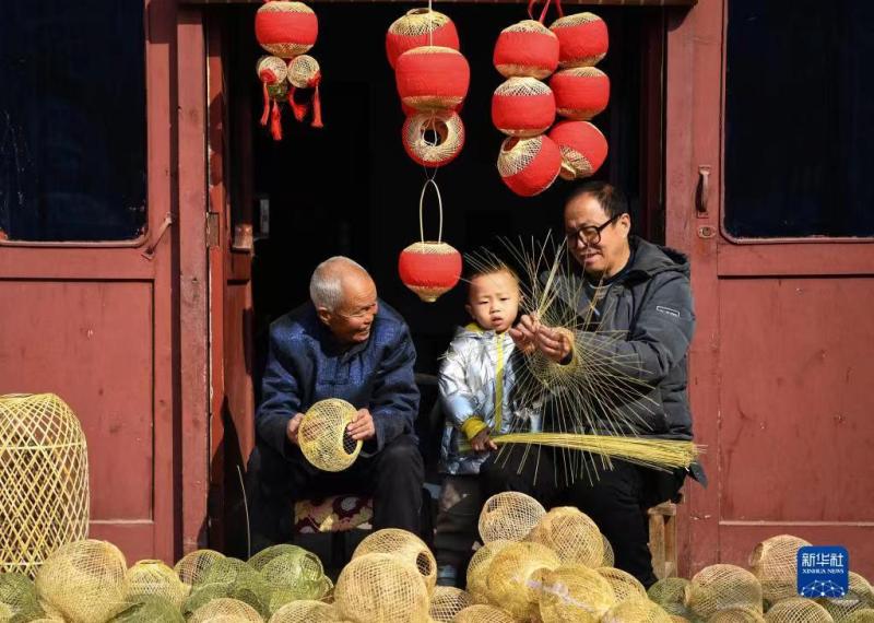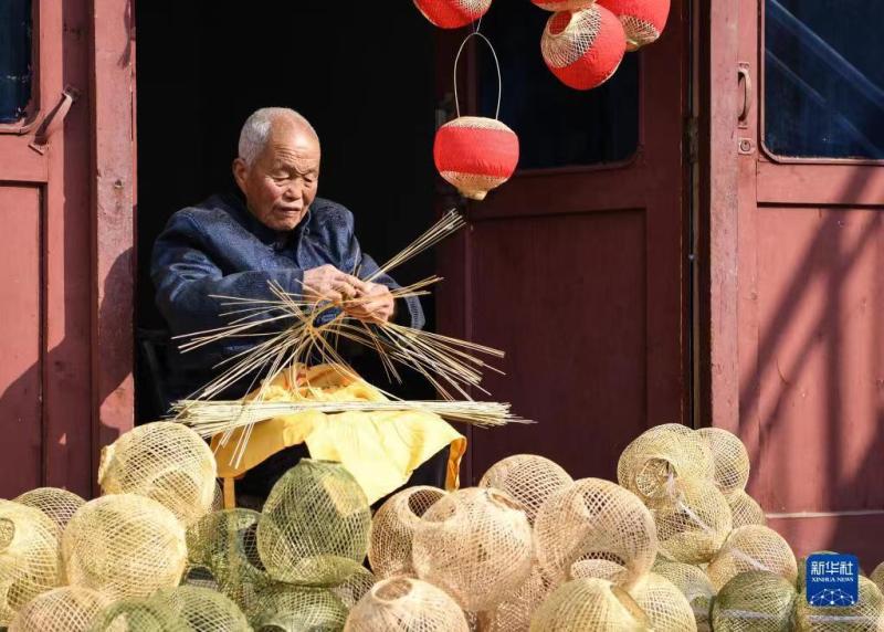 王学坤在西安市灞桥区白鹿原上的非遗基地展位编织竹篾灯笼(2月4日摄)。