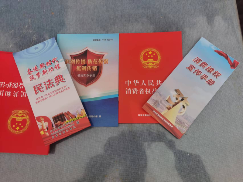 活动现场设立了法治宣传咨询台,通过悬挂条幅、发放《中华人民共和国民法典》、《中华人民共和国消费者权益保护法》、《消费维权知识手册》、“打击传销”宣传彩页等法律法规资料开展普法宣传。