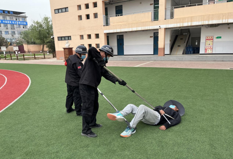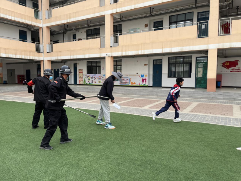 现场模拟事发场景,形象生动地展现了歹徒持刀冲进校内行凶的过程,这个演练过程紧张有序进行,最终将不法分子制服。