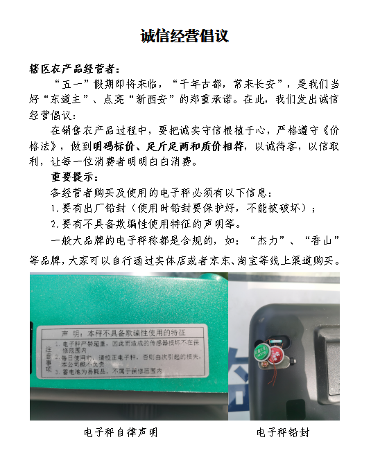 专项行动中,执法人员重点检查了白鹿仓景区周边、灞临公路两侧经营樱桃等农产品的摊贩。主要检查其销售农产品过程中是否存在缺斤少两的情况、所使用计量器具是否合规及使用过程是否规范、是否对所售商品进行了明码标价。同时向经营者发放了《诚信经营倡议书》,倡导其做到明码标价、足斤足两和质价相符。