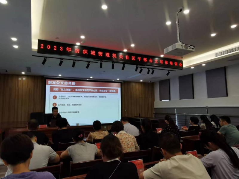 为进一步提高街道机关、社区(村)干部公文写作、处理水平,扎实推进“干部作风能力提升年”活动走深走实,8月18日下午,纺织城街道特邀灞桥区委办副主任薛锋进为街道机关、社区(村)干部进行公文专题培训。机关各科室、各社区(村)干部共计100余人参加了本次讲座。