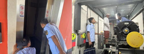 在对该景区观光塔电梯的检查中,现场要求景区工作人员演练了电梯因故障停机困人的场景。演练中,电梯维保公司工作人员在规定时间内到达现场,使用三角钥匙打开厅门确认电梯轿厢停留位置后迅速到达机房,在关闭电梯主电源后维保人员与景区工作人员共同配合使用盘车轮使电梯轿厢缓慢升到就近的平层位置,随后救援人员用三角钥匙打开厅门,拉开轿门,便可放出轿厢里的乘客。演练过程中,执法人员发现电梯维保人员与景区工作人员救援时配合不够流畅、工作人员缺少对被困人员的安抚等情况,要求运营公司针对相关问题进行改进。