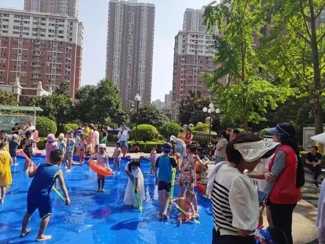 热浪蒸腾,欢呼声不断,孩子们愉快地玩耍着,场边的居民们也在愉快地聊天说笑,街道、社区工作人员同步尽心做好现场安全提醒、保洁等后勤服务工作。