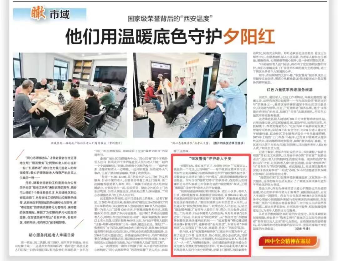 《西安日报》(2025年11月20日)刊登《国家级荣誉背后的“西安温度” 他们用温暖底色守护“夕阳红”》通讯文章,深度报道全国敬老文明号集体——灞桥分局纺织城派出所“银发警务”工作成效。
