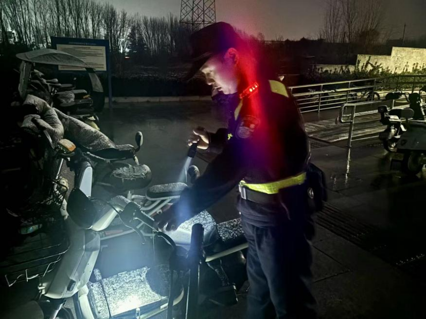 当城市渐入梦乡,灞桥派出所的夜巡民警手持强光手电,穿梭在地铁站周边、街巷车位间,开展细致的夜间“安全体检”。光束聚焦电动车的U形锁、电瓶仓,查看是否锁闭牢固;扫过私家车的车窗与车门,确认是否关严锁实。遇到车主疏忽未锁的情况,民警第一时间联系车主,用一次次俯身查看、一遍遍光束巡扫,将防盗提醒落到实处,这束深夜里的光,不仅照亮了车辆细节,更暖了群众的心。