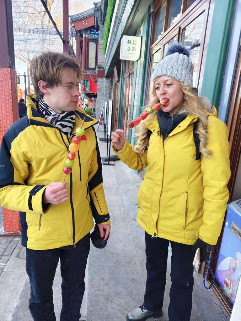 德国游客乌尔丽克与埃米尔在什刹海吃糖葫芦。新华社记者 于佳欣 摄