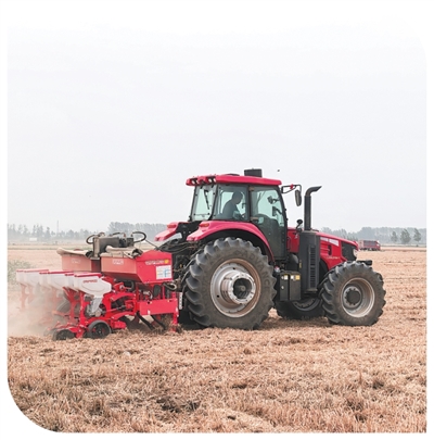 在赵岗镇永业家庭农场,农机手驾驶气吸式精量播种机播种玉米。