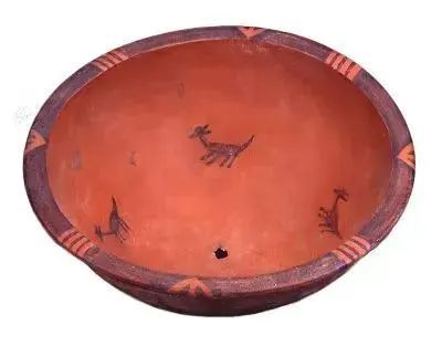 彩陶鹿纹盆,1955年出土于西安半坡遗址,现藏于西安半坡博物馆。它圜底、浅腹,红底黑彩,陶质细腻。宽口沿上装饰着箭头纹和直线纹,恰好把圆周八等分,盆内等距离绘有四只活泼可爱、神态各异的小鹿,栩栩如生,给人一种劳动之余轻松舒畅的享受,让人深深的感受到鹿即是美的那种审美意识已在这里悄悄萌动。