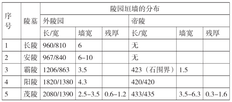 自霸陵开始,帝后单独设立陵园,陵园的建筑形式有所不同,帝陵陵园是由河卵石平铺形成的一层“石围界”,后陵则为夯土墙体。霸陵的外垣墙,东西残长1206米,南北宽863米,墙址宽3.5米。这周夯墙将文帝陵园和窦皇后陵围合在一起,应为霸陵的外陵园墙址,形成了霸陵陵园。值得注意的是,霸陵陵园内的窦皇后陵,其陵园的东墙、北墙共用了霸陵陵园的东、北外垣墙,在规模上也略小于阳陵和茂陵,但从陵园的长宽比来看,几乎与阳陵、茂陵相似,约为3∶2,帝陵陵园则与阳陵帝陵陵园长度几乎一致。