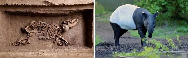 印度野牛(Bos gaurus):别名白肢野牛、野黄牛、白袜子、亚洲野牛等,分布于南亚、东南亚、我国云南省西双版纳及普洱等地,以其特大的身躯吸引着人们的眼球,是现存世界上体型最大的牛之一。印度野牛骸骨也是此次发掘所有坑中最大的一个动物骨架,比殷墟的“殷牛”(Bos exiguous )要大得多。印度野牛在我国北方考古遗址中属首次发现。