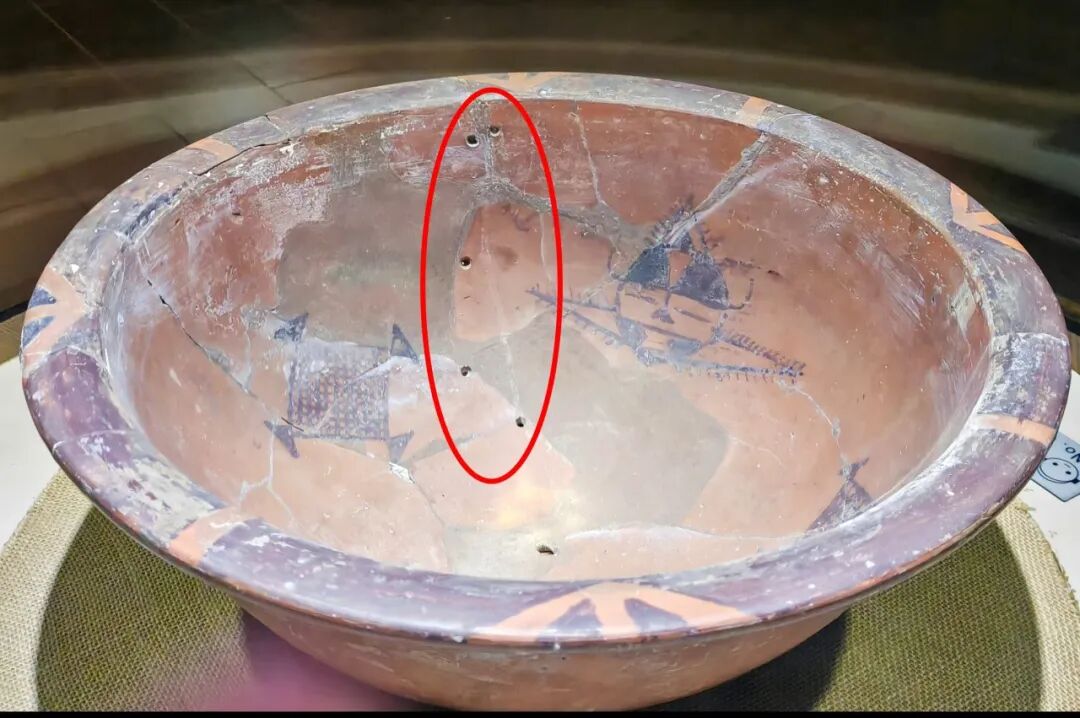人面网纹彩陶盆,西安半坡博物馆展示出比较珍贵的一件文物,它是小孩瓮棺盖的一部分。除了底部供小孩灵魂出入的小孔外,大家仔细看,还可以发现在陶盆内壁侧面也有好几个孔眼,没错,这几个孔眼就是半坡先民修补陶器留下的痕迹。其实瓮馆盖并不是专门烧制出来的葬具,之前有可能也是生活用具,小孩不幸夭折后,人们选取合适的陶器用来埋葬他们。