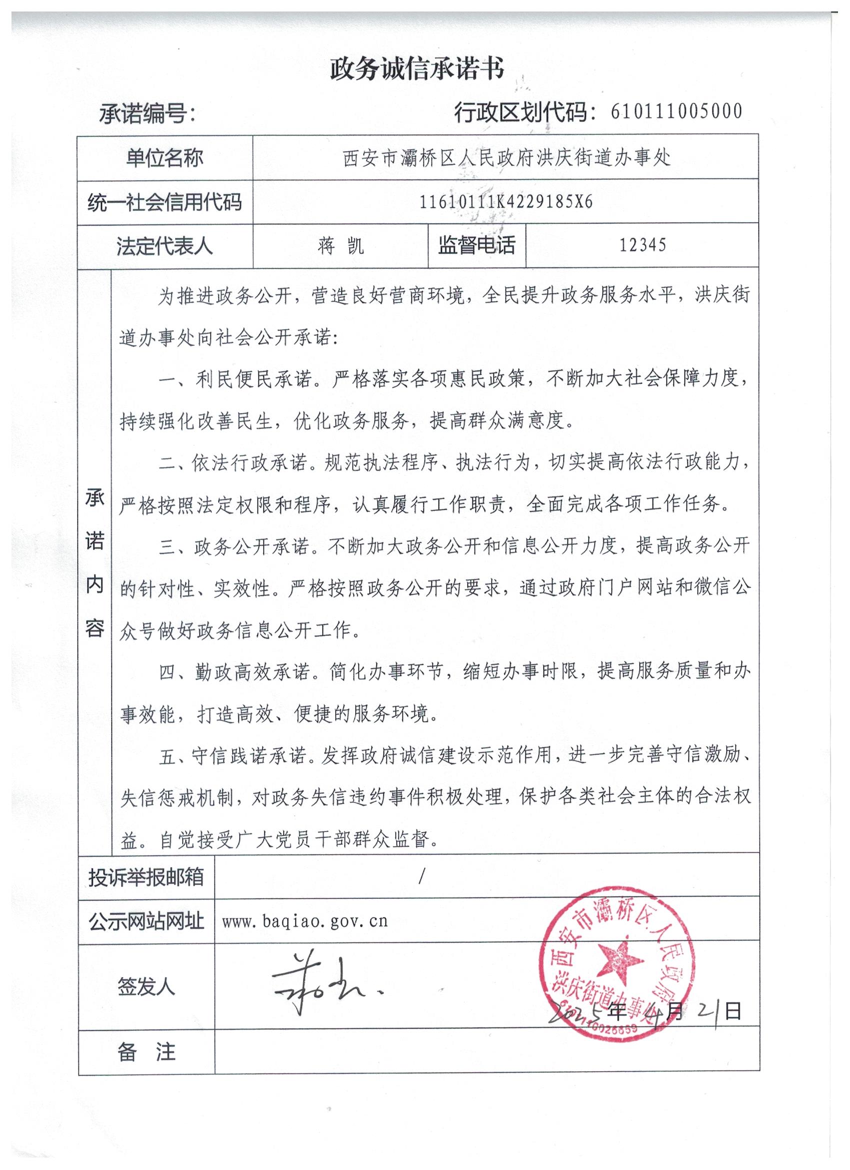 洪庆街道政务诚信承诺书