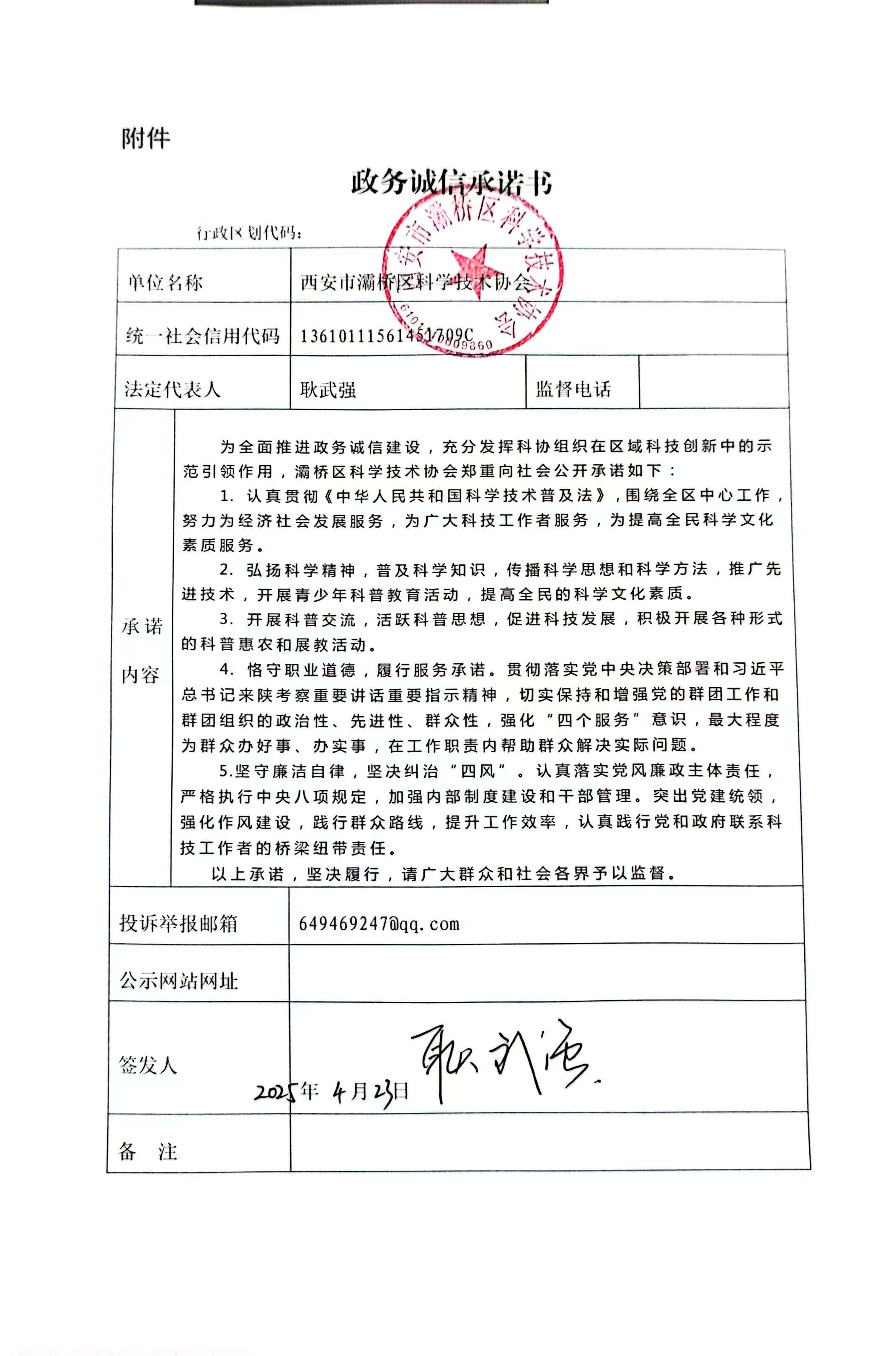 灞桥区科学技术协会政务诚信承诺书