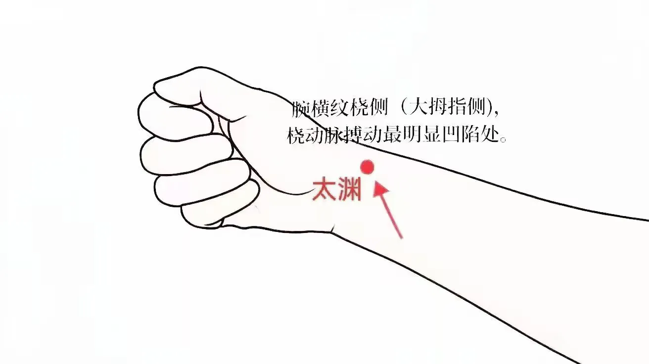 太渊,手太阴腧穴。输穴,原穴,八会穴(脉会)。有祛风化痰、理肺止咳、通经活络功效。对无脉症、腕痛无力也有效果。