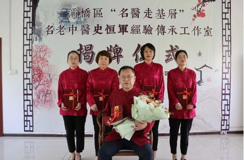 名中医史恒军先生与灞桥区副区长樊明、市中管局调研员刘智敏、灞桥区政府办副主任穆艳涛、空军军医大学唐都医院门诊部副主任芦希艳,共同为灞桥区“名医走基层”名中医史恒军经验传承工作室进行揭牌。