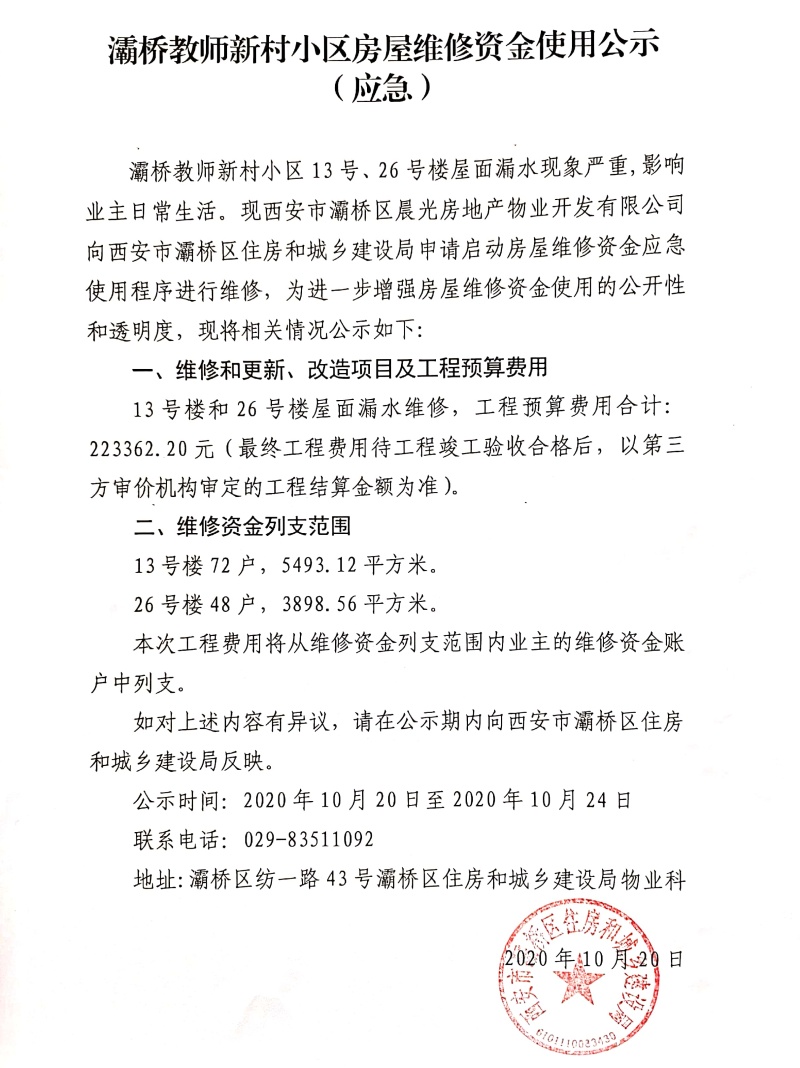 灞桥教师新村小区房屋维修资金使用公示(应急)