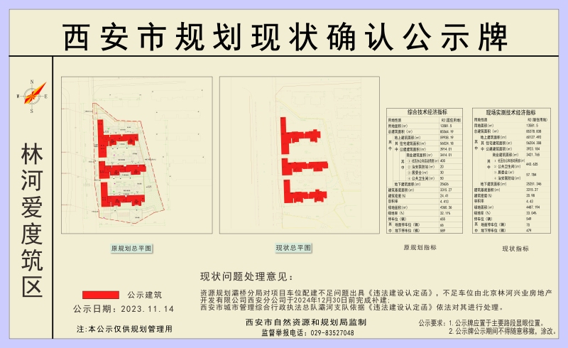 林河爱度筑区项目位于灞桥区纺渭路以东、纺建路以南,建设单位为北京林河兴业房地产开发有限公司西安分公司。按照灞桥区处理房屋办证遗留问题领导小组办公室要求,现将拟规划现状确认内容公示如下: