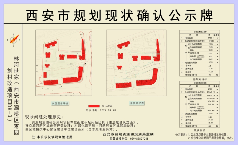 林河世家项目位于西安市灞桥区鹿塬街以西,建设单位为北京林河兴业房地产开发有限公司西安分公司。按照灞桥区处理房屋办证遗留问题领导小组办公室要求,现将拟规划现状确认内容公示如下: