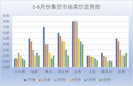 4.蔬菜价格呈持续下滑走势。1-6月份,列入价格监测目录的15种居民常规蔬菜均价3.8元/斤,同比去年10降5平,平均下浮24.12%。15种蔬菜月环比9降3平3升,平均下降12.48%,其中,集贸市场出售的大白菜1.2元/斤,降幅20%;油麦菜2元/斤,降幅20%;西红柿2元/斤,降幅33.33%;豆角4元/斤,降幅11.11%;土豆1.2元/斤,降幅20%;莲花白1元/斤,降幅16.67%;黄瓜2元/斤,涨幅33.33%;韭菜2.5元/斤,涨幅25%。随着夏季到来,气温上升,三季度蔬菜供应以本地蔬菜为主,流通成本降低,蔬菜价格整体呈下滑趋势,青椒、莲花白、西红柿等蔬菜价格下调尤为明显。
