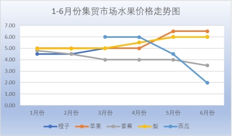 5.水果价格稳中有降。上半年,水果零售价格涨少降多,截至6月底,随着季节性因素,各类水果大量上市,特别是西瓜,供应量不断提高,水果市场竞争愈加激烈,价格处于季节性下行通道。监测的5种水果呈2降3平态势运行,其中,集贸市场出售的香蕉4.9元/斤,降幅12.5%;西瓜1.98元/斤,降幅20.8%,橙子、苹果、梨环比持平。