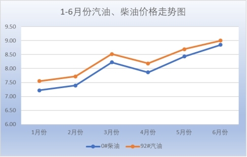 价格监测数据显示,1-6月份,汽油、柴油的价格呈现波浪式继续走高态势。4月中旬油价虽略有回落,但很快向上浮动,截至6月底,92号汽油9元/升,同比涨幅29.12%,环比涨幅3.57%;0号柴油8.85元/升,同比涨幅33.69%,环比涨幅4.98%,预计三季度油价将从高处平稳走低。农产品类国产尿素2500元/吨,涨幅5.9%,一季度化肥市场特别是尿素波动较大,主要因为今年以来粮食价格有所上涨,农户种植积极性提高,而市场上经销商拿货积极性未及时跟进,导致尿素库存不高,供应紧张。天然气(一级阶梯价)2.05元/立方;民用液化气110元/罐(每罐12公斤);民用照明用电0.498元/度,大部分服务类商品价格仍保持平稳。
