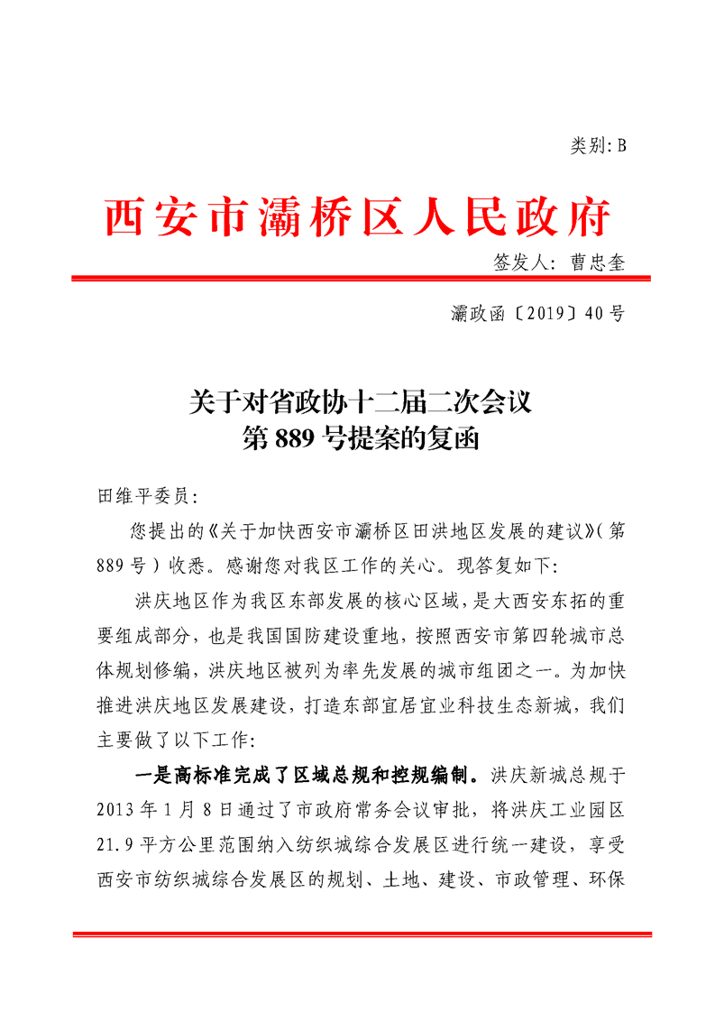 西安市灞桥区政府对省政协十二届二次会议第889号提案的复函