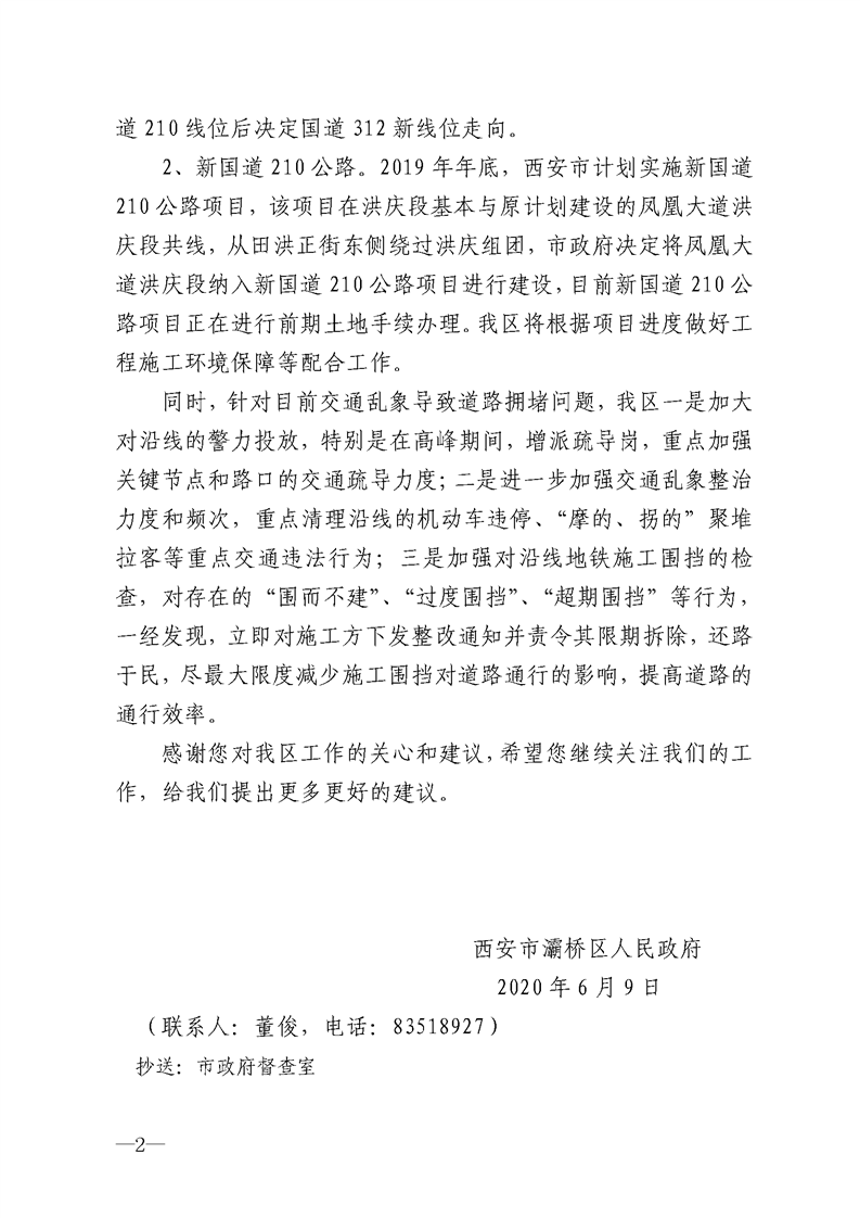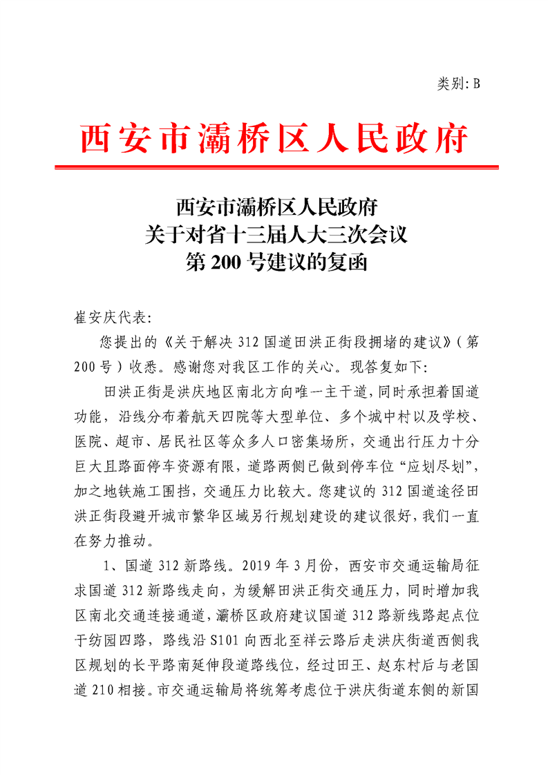 西安市灞桥区人民政府对省十三届人大三次会议第200号建议的复函
