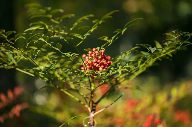 秋冬时节的南天竹,随着天气的变冷,原本青绿的叶片会慢慢转红,穗状的果实结满枝头,赤红如珊瑚一般,十分的鲜红可爱。然而南天竹全株都是有毒的,特别是红色的小果子毒性更强,因为它里面含有多种生物碱,毒性很大,如果误食,可能会引起心律失常、血压下降、呼吸困难、肌肉痉挛等症状,此时一定要及时催吐、送医,以免留下后遗症。