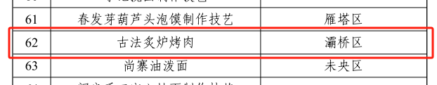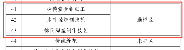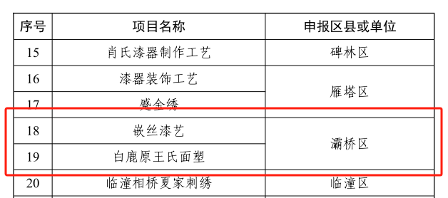 2025年3月27日,西安市人民政府公布“西安市第七批非物质文化遗产代表性项目名录”。其中,由灞桥区推荐的“嵌丝漆艺、白鹿原王氏面塑、树德堂金银细工、木叶盏烧制技艺、徐氏陶塑制作技艺、古法炙炉烤肉”成功入选。