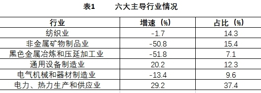 从行业来看,六大主导行业“二升四降”。六大主导行业产值占全区总产值的70.4%,同比下降13.3%,拉低全区产值增速9.7个百分点。全区六大主导行业中仅有通用设备制造业和电力、热力生产和供应业为正增长,增速分别为20.2%、29.2%,共拉动全区产值增速6.9个百分点;非金属矿物制品业、黑色金属冶炼和压延加工业、电气机械和器材制造业、纺织业产值增速分别为-50.8%、-51.8%、-13.4%、-1.7%,4个行业共拉低全区产值增速16.6个百分点。