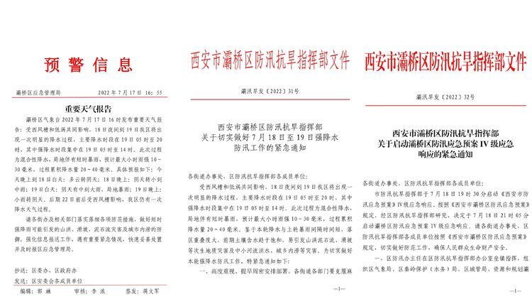 7月17日下午发布了强降水预警信息,7月18日上午区防指下发《关于切实做好7月18日至19日强降水防汛工作的紧急通知》,7月18日21时05分启动灞桥区防汛应急预案IV级应急响应,对我区应对强降雨工作先后进行安排部署,要求各街办各部门落实防范措施,加强重要隐患点的力量预置和防御工作。