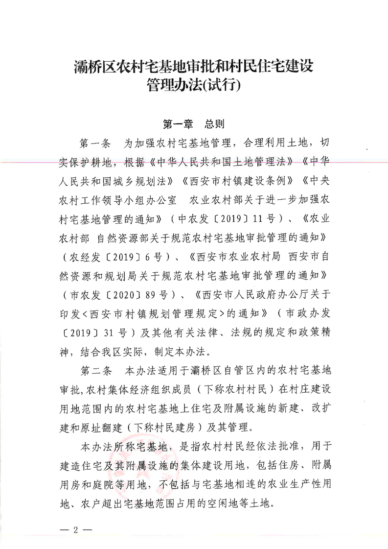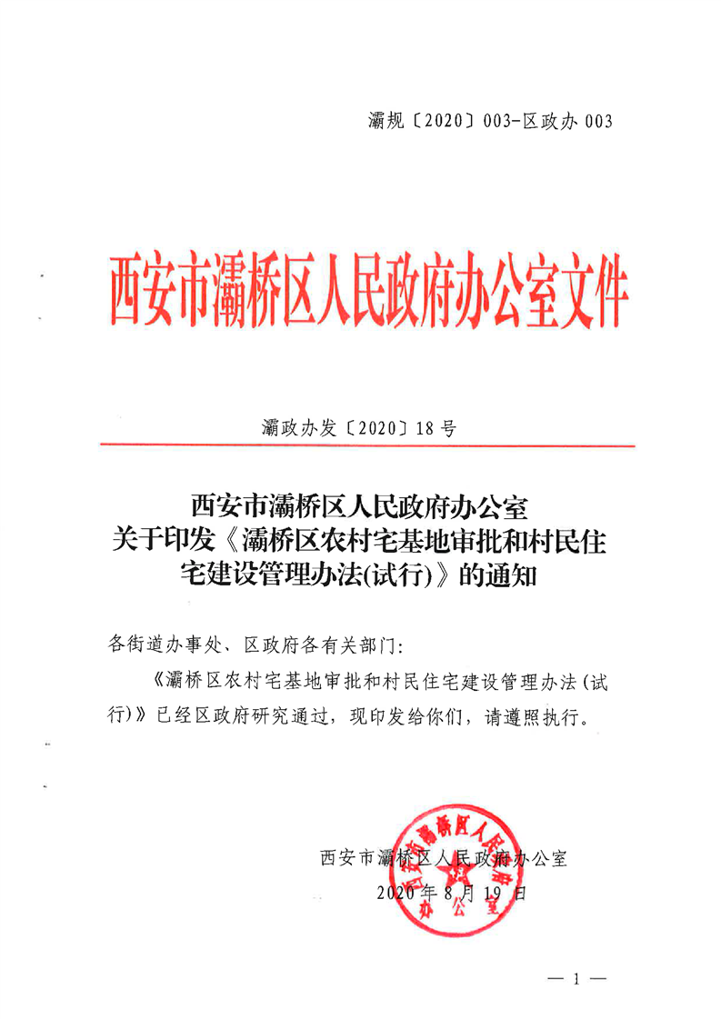 西安市灞桥区人民政府办公室关于印发《灞桥区农村宅基地审批和村民住宅建设管理办法(试行)》的通知 灞规〔2020〕003‐区政办003