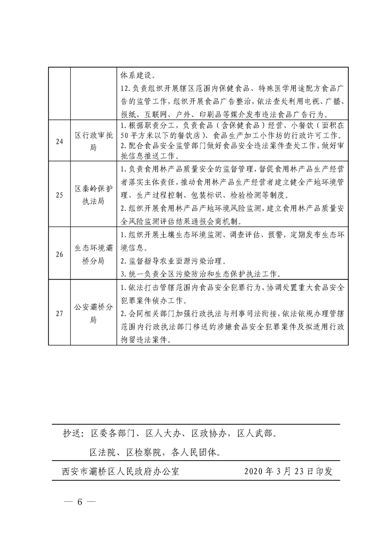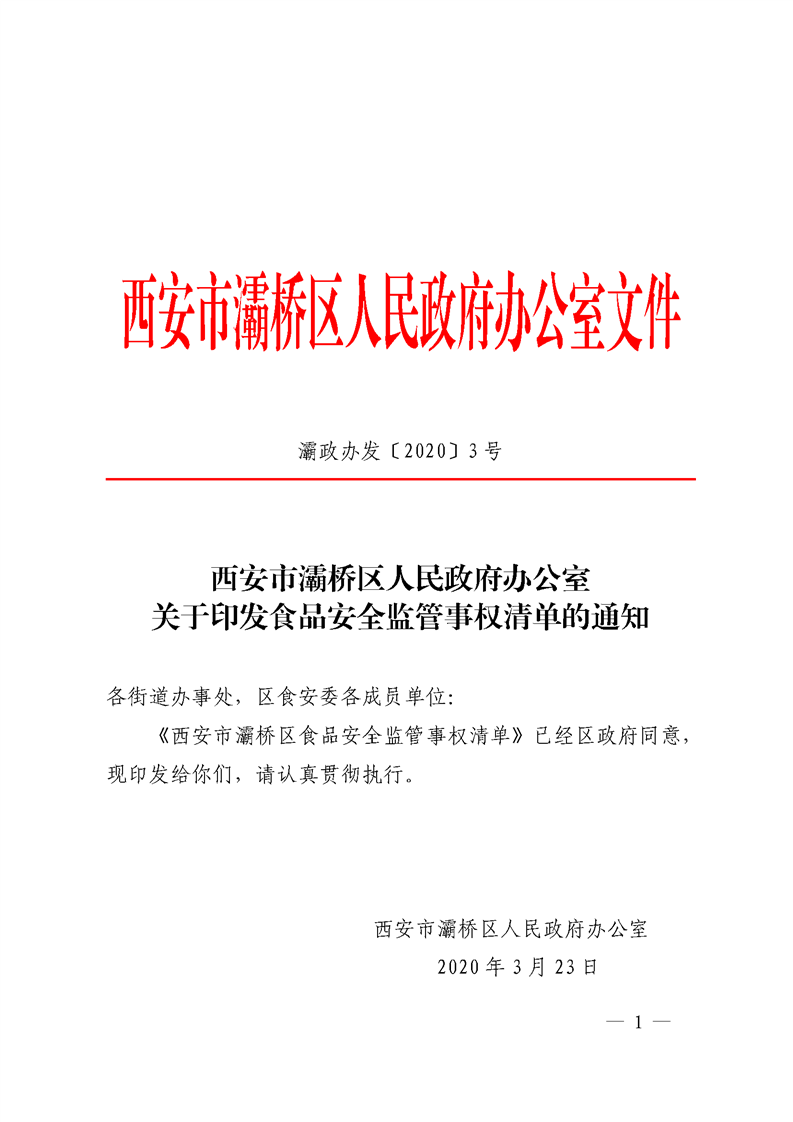 西安市灞桥区人民政府办公室关于印发食品安全监管事权清单的通知 灞政办发〔2020〕3号