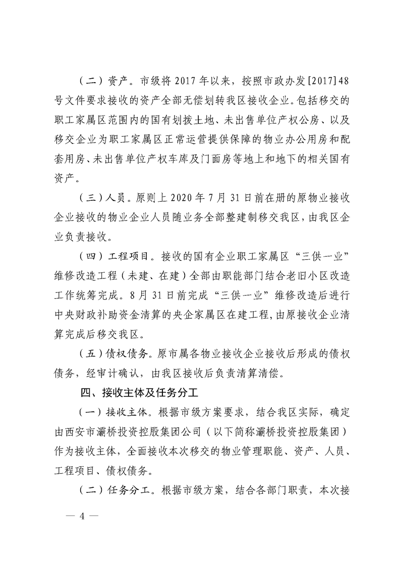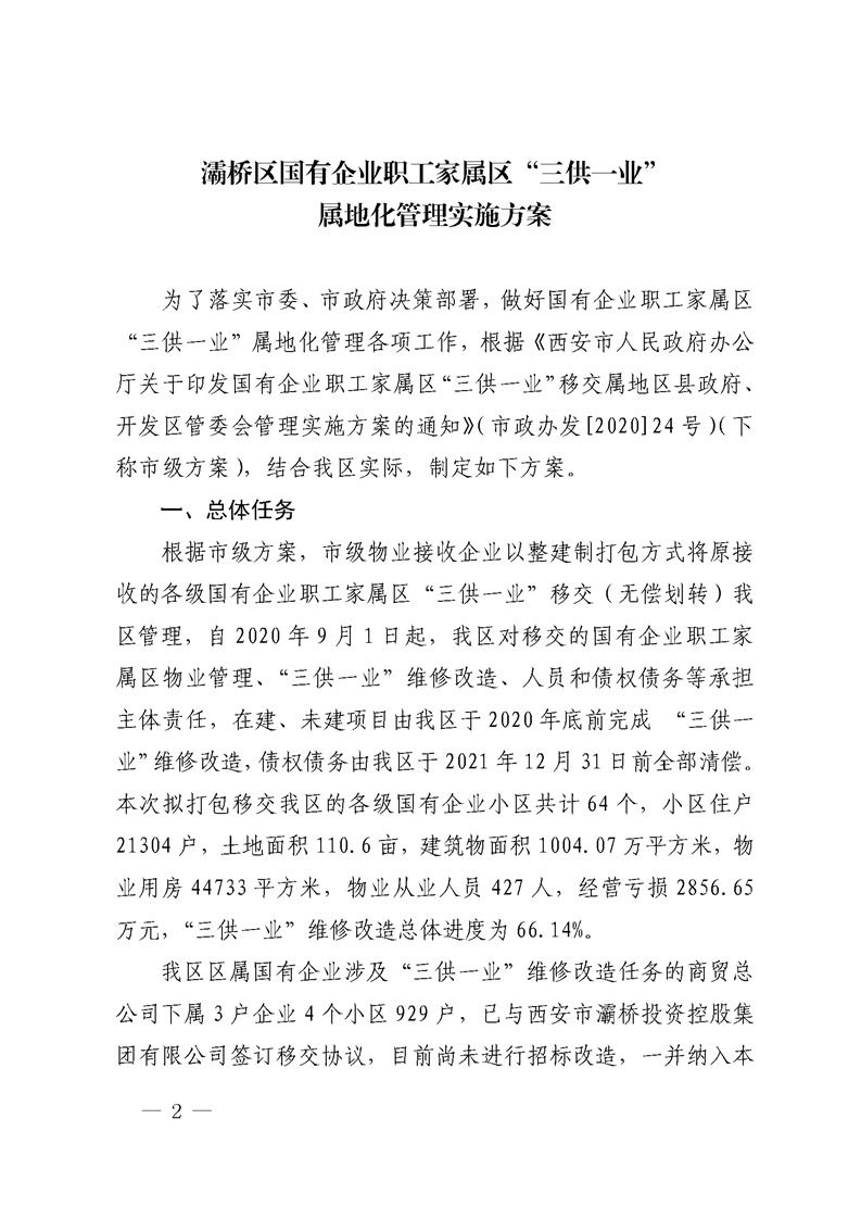 西安市灞桥区人民政府办公室关于印发灞桥区国有企业职工家属区“三供一业”属地化管理实施方案的通知 灞政办发〔2020〕20号