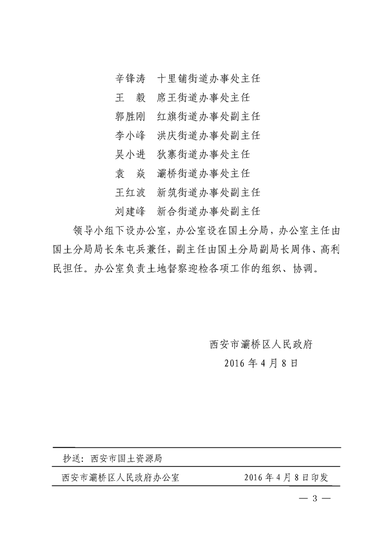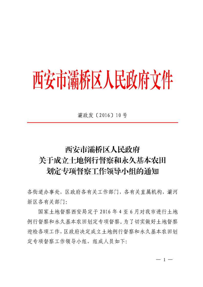 西安市灞桥区人民政府关于成立土地例行督察和永久基本农田划定专项督察工作领导小组的通知 灞政发〔2016〕10号