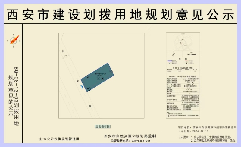 BQ-08-12-03位于西安市灞桥区BQ-08单元内,西安市灞桥区行政管辖区内,位于东城大道以南、洪威路以东。地块用地性质为供电用地(1303),净用地面积为0.40ha(约6.016亩,以实测成果为准),地上建筑面积≤2005.5㎡,建筑密度≤30%,拟定容积率≤0.5。地下建筑面积最终面积以方案审核为准。人防面积、建筑高度在方案审核阶段以人防部门和机场管理部门(中部战区)意见为准。机动车和非机动车停车位数量依据《西安市建设项目停车位配建标准》(市资源发〔2023〕3号)配置,以最终审批方案为准。
